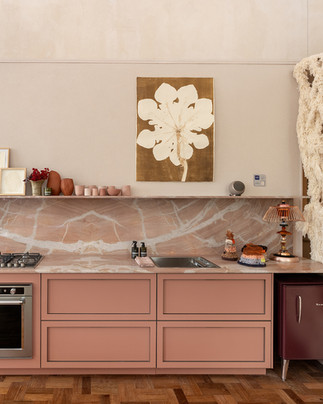Cada peça foi escolhida com precisão para compor uma narrativa coerente entre forma e sensibilidade. Acabamentos que remetem a tramas artesanais, pedras naturais e perfis metalizados em bronze evocam equilíbrio e contemporaneidade. Na área de banho, a linha Linear ganha protagonismo com gabinetes em pintura fosca e delicados puxadores. Já no dormitório, o painel amadeirado Wall System se une ao closet ventilado da Timeless Collection, com acabamento Light Wood, escolhido pela arquiteta para dialogar com a paleta rosada do espaço. A sala de estar mantém a linguagem da coleção Timeless, com nichos que valorizam a arquitetura do loft, enquanto a cozinha compacta e funcional da linha Shaker, é marcada pela bancada fornecida pela Boutique Della Rocca, em mármore rosa “Esplêndido”, cuja tonalidade se repete em diferentes pontos do ambiente, reforçando a coesão cromática do projeto.