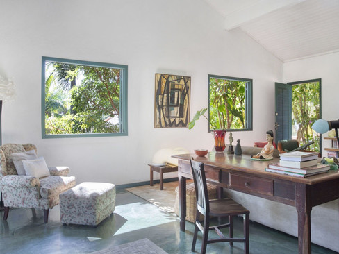 A casa tem estilo praiano, com piso em cimento queimado e cerâmica (com alguns tapetes Kilim), telhas de cerâmica e mourões de madeira escura, paredes externas em tom rosa mosqueta, com portas de madeira e vidro e janelas verdes. Os móveis são, em sua maioria, de madeira, em estilo moderno dos anos 60 ou colonial, com algumas peças de família e de artesanato mineiro e indígena. A residência tem ainda muitos quadros de valor afetivo para João, tanto de artistas plásticos como de arquitetos: tem obras de Firmino Saldanha (tio-avô), Chico Cunha (amigo de infância), Ione Saldanha (tia), Alexandre Gaudereto e dois desenhos de Beatriz Milhazes. A casa possui três varandas, com cinco redes, duas no andar térreo e três no andar superior.