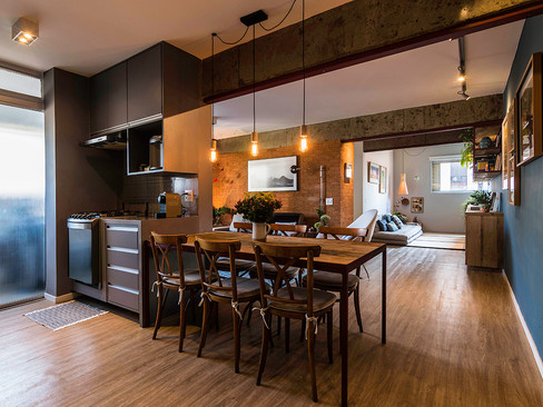 Antes da reforma, o apartamento contava com ambientes compartimentados e, por isso, menores, como era o caso da cozinha. Uma parede separava o corredor para os quartos da sala de estar e havia dois dormitórios fechados. O escritório optou por eliminar as paredes da cozinha, reposicionou o banheiro para a área de serviço, removeu a parede do corredor e abriu um dos quartos, integrando ao estar, o qual passou a ser uma sala tatame.
