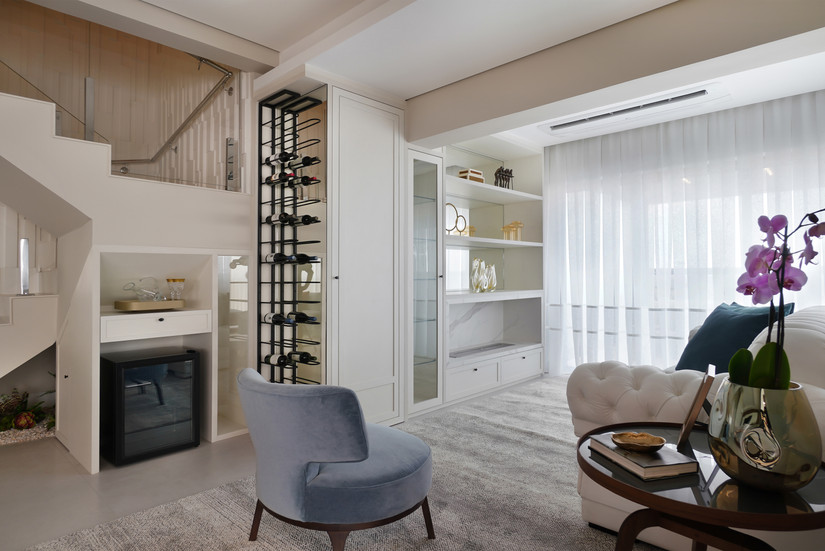 A decoração aposta em tons suaves de madeira e off-white, reforçando a ideia de amplitude e acolhimento. A mesa de jantar foi posicionada na varanda, permitindo que as refeições se tornem experiências ao ar livre, enquanto um living mais intimista com lareira e adega garante o equilíbrio entre convívio e privacidade.