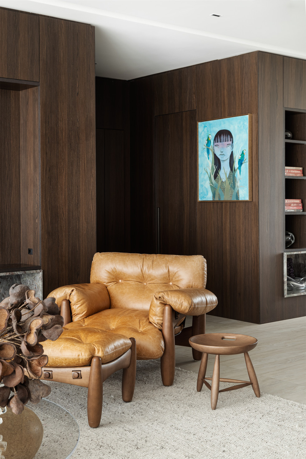 O uso de materiais sóbrios e de alta qualidade dá unidade ao projeto. Mármore branco com nuances de cinza, tecidos em bouclê, linho e cetim, além da madeira escura, criam uma base de sofisticação discreta. A atmosfera é enriquecida por obras de arte e mobiliário autoral, como a poltrona Mole e a Jangada, peças icônicas de Sergio Rodrigues, que reforçam a identidade do espaço.