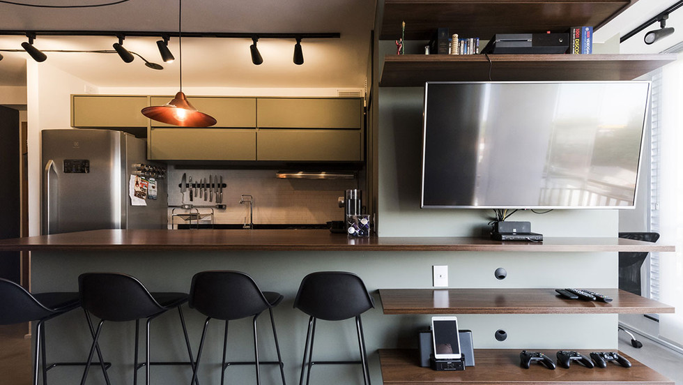 A mesma bancada que apoia a televisão e serve de mesa de jantar tem muito espaço escondido. Abaixo do móvel versátil é possível posicionar o micro-ondas, uma adega, além de gavetões e armários para despensa. “Com um bom planejamento não faltará local para guardar os utensílios diários”, conta a arquiteta.