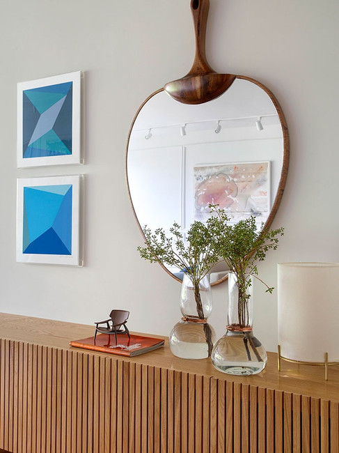 “O apartamento já apresentava uma planta muito boa. Ele é amplo e possui sala e cozinha enormes, que compreendem 60% do imóvel. Nós então adaptamos o espaço aos tempos atuais e às necessidades dos clientes”, afirma Bernardo. “Para isso, integramos o antigo e estreito hall de entrada à sala, conferindo amplitude ao living. Para delimitar visualmente o hall e camuflar o acesso à cozinha e à área íntima, revestimos paredes e teto com painéis em folha natural de carvalho, sugerindo a ideia de um cubo em madeira”, descreve o arquiteto, que optou por uma paleta de cores neutra, em que predomina a cor branca, com toques de cor nas obras de arte e acessórios. Já o piso de tacos, com paginação espinha de peixe, é original e foi restaurado.