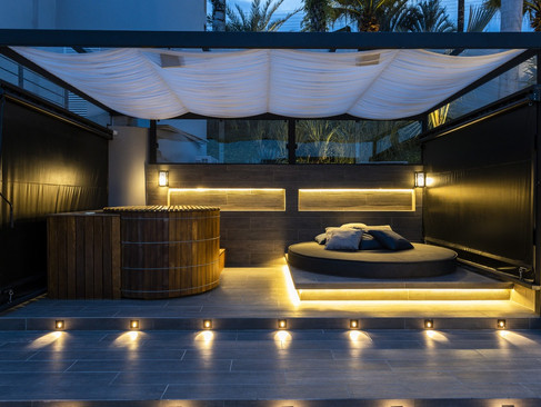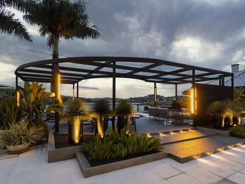 A área externa conta ainda com diferentes espaços, como o coberto com pergolado e ambientado com futon e ofurô para relaxar, além de cantinho SPA, com hidromassagem e lareira a gás. Subindo as escadas da área gourmet, vem a área de lazer, com um lounge com lareira, espaço de café, área de bar e uma mesa de jogos. Ao fundo, uma sala de TV bem intimista.