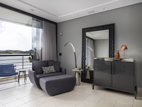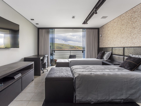 Os dormitórios dos clientes foram posicionados abaixo do nível do solo para que ficassem mais reservados e próximos à represa, enquanto os hóspedes ficam alocados em cima do andar do lounge. “Na casa de hóspedes, o desafio era o pé direito baixo, que no decorrer da obra percebemos que era possível fazer um mezanino confortável, que permitiu criar um mezanino confortável para abrigar em cada quarto uma família”.