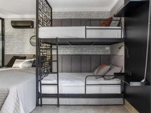 No quarto do adolescente, as arquitetas trouxeram duas camas de solteiro e um sofá que também pode ser utilizado para acomodar algum amigo. O espaço também conta com uma área de estudos e baús para acomodar os pertences do morador. Há ainda uma área de jogos, com espaço para o computador gamer, sofá bem confortável e uma mesa de pingue-pongue.