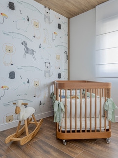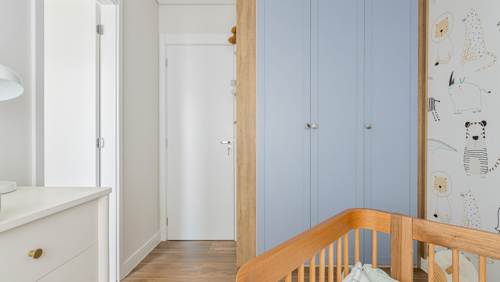 A suíte do bebê trouxe o papel de parede com animais, junto ao berço de madeira e a marcenaria em azul, destaque do projeto. “Com o propósito de tornar o apartamento em um refúgio para o filho do casal, criei ambientes aconchegantes e amplos. Por isso, um dos destaques do apartamento é a suíte do pequeno, mostrando que a simplicidade transmite elegância através de mobiliários minimalistas e poucos elementos.”.