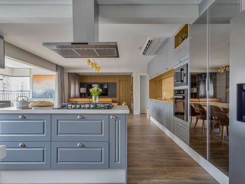 O estilo arquitetônico contemporâneo é predominante no projeto. “O estilo contemporâneo tem como característica principal, a funcionalidade com espaços amplos e integrados, trazendo uma percepção de liberdade e fluidez”, conta a arquiteta. Com isso, a cozinha, antes isolada, foi integrada às salas, promovendo a convivência social entre os moradores no cotidiano.