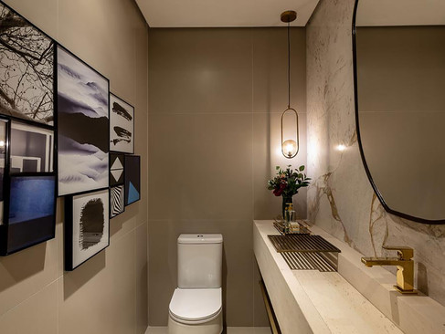 Para trazer ainda mais a sensação de casa e manter o alto padrão do projeto de decoração, o lavabo recebe em sua composição prateleiras suspensas com caixaria nude, envoltório e frentes com pintura em laca na cor Titan Opaco Dourado.