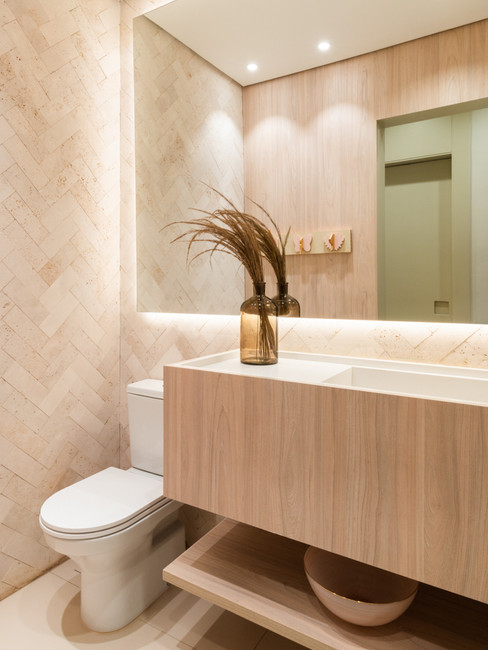 Jogo entre os revestimentos para uma paginação diferente. Utilizado MDF Tirol, da Arauco, com o tijolinho Anatolia Bruto tradicional, da Palimanan, que foi instalado na paginação escama de peixe.