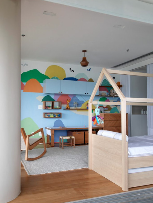 O quarto do filho deveria ser um local amplo, seguro, confortável e estimulante. A arquiteta trouxe o Rio de Janeiro em cores no papel de parede para o menino que mora em Portugal aprender, aos poucos, sobre suas conexões brasileiras. O espaço dispõe de área livre para brincadeira, brinquedos ao alcance das mãos com fácil visualização e organização, além de uma mesa interativa onde o papel corre e forma uma grande tela para desenho e pintura. Muitos livros estão à disposição, com direito a uma poltrona para a leitura antes do soninho.