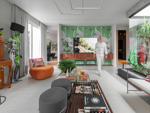 No que diz respeito à paleta de cores, antes de defini-la, Marco recebeu um pedido: “nada de branco nos ambientes”. O casal queria tonalidades vibrantes. Verde, laranja e rosa dão toques especiais à base cinza. Muitas estampas e texturas reforçam esse clima divertido, maximalista, do jeito que os moradores sonhavam. Um exemplo é o sofá do living em verde-água (design de Mauricio Bonfim) contrastando com o tapete indiano em estampa floral, feito sob medida.